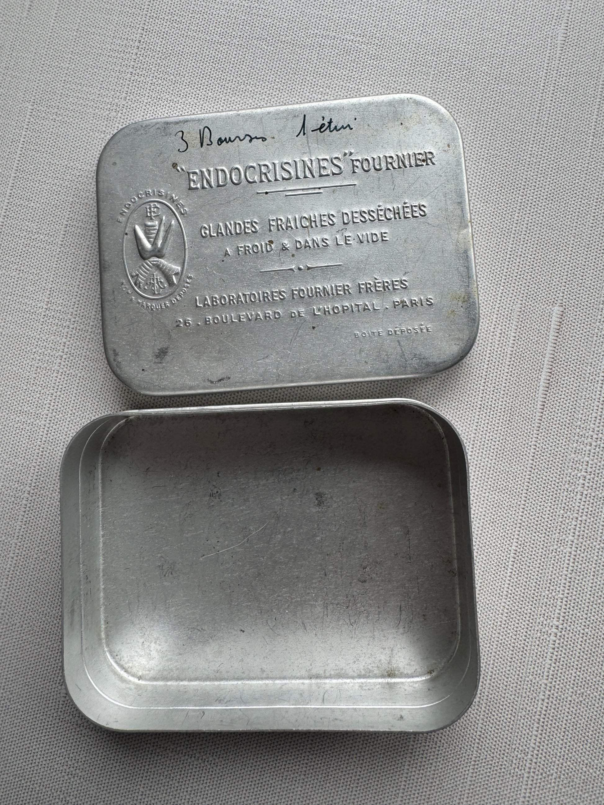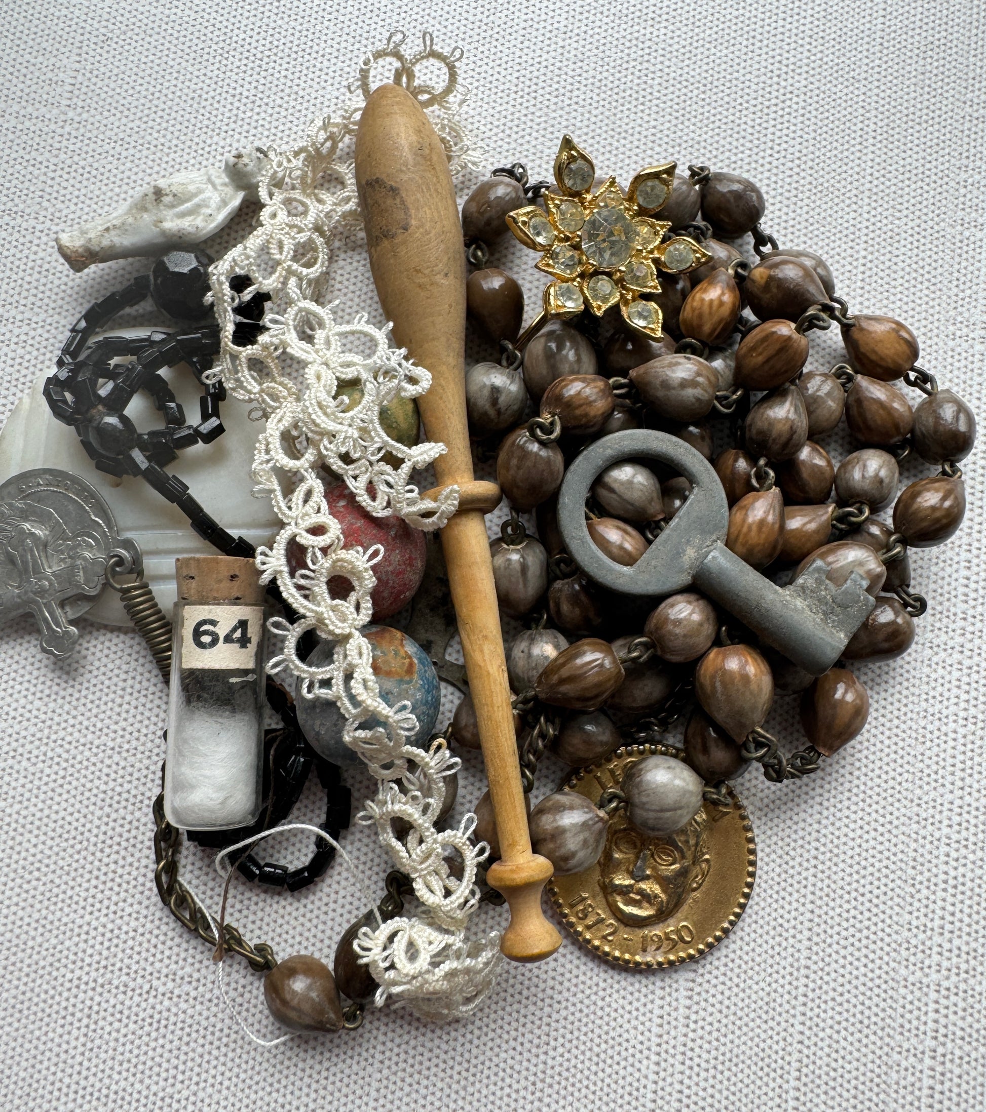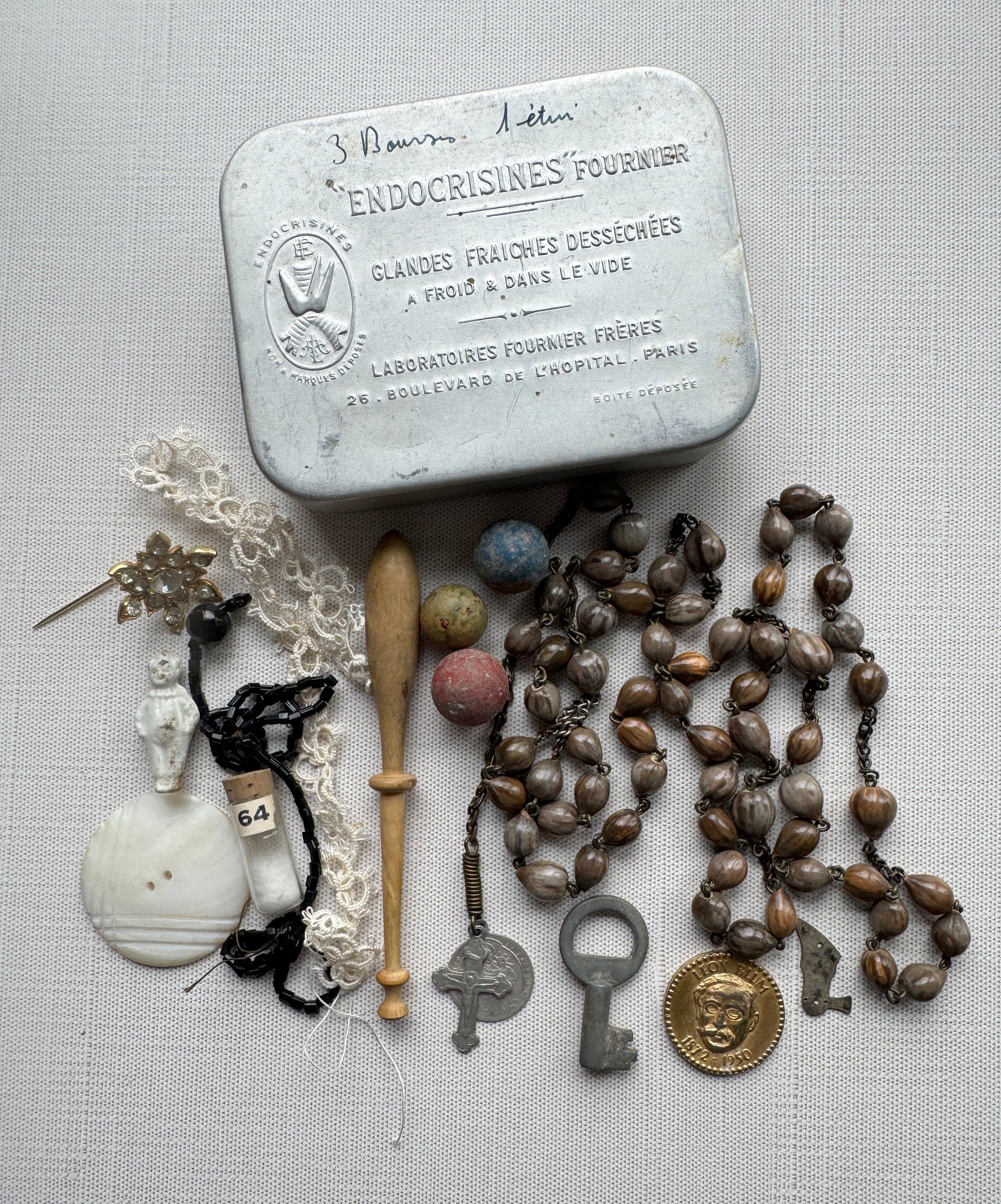 Antique French Curio Tin, Rosary, Lace, Keys, Doll, Oddities & More