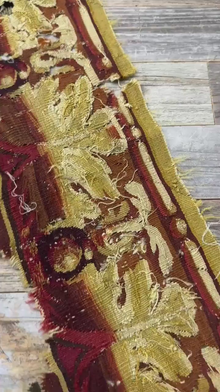 Condition: shows significant age-related wear consistent with its age. There are multiple areas of thread loss, fraying along the edges, small holes, and some thinning or separation in the weave. The colors have softened and faded beautifully over time, adding to its authentic, timeworn character. Structurally fragile in places and best suited for decorative use, framing, or study. Please view photos carefully for details. Measures 35" x 7.5".