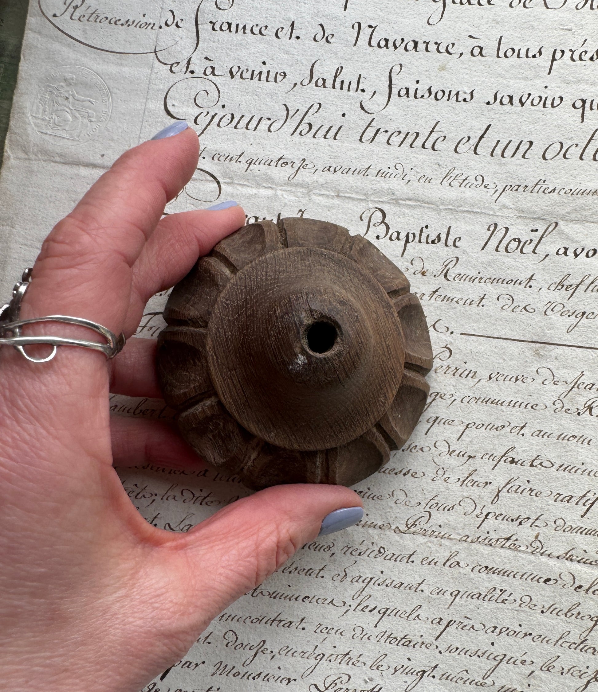A beautifully aged, hand-carved wooden finial featuring a petal-like scalloped design and a central borehole for mounting. This architectural salvage piece likely once adorned the top of a bedpost, newel post, or piece of early furniture. The raw wood shows natural patina and wear, highlighting its age and craftsmanship. A lovely accent for restoration projects or a unique decorative object for primitive or rustic decor. Measures 3.25" in diameter.