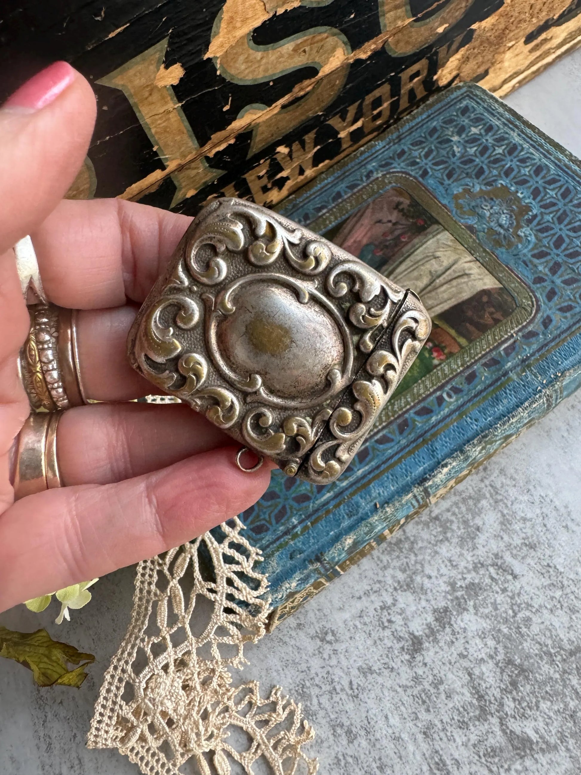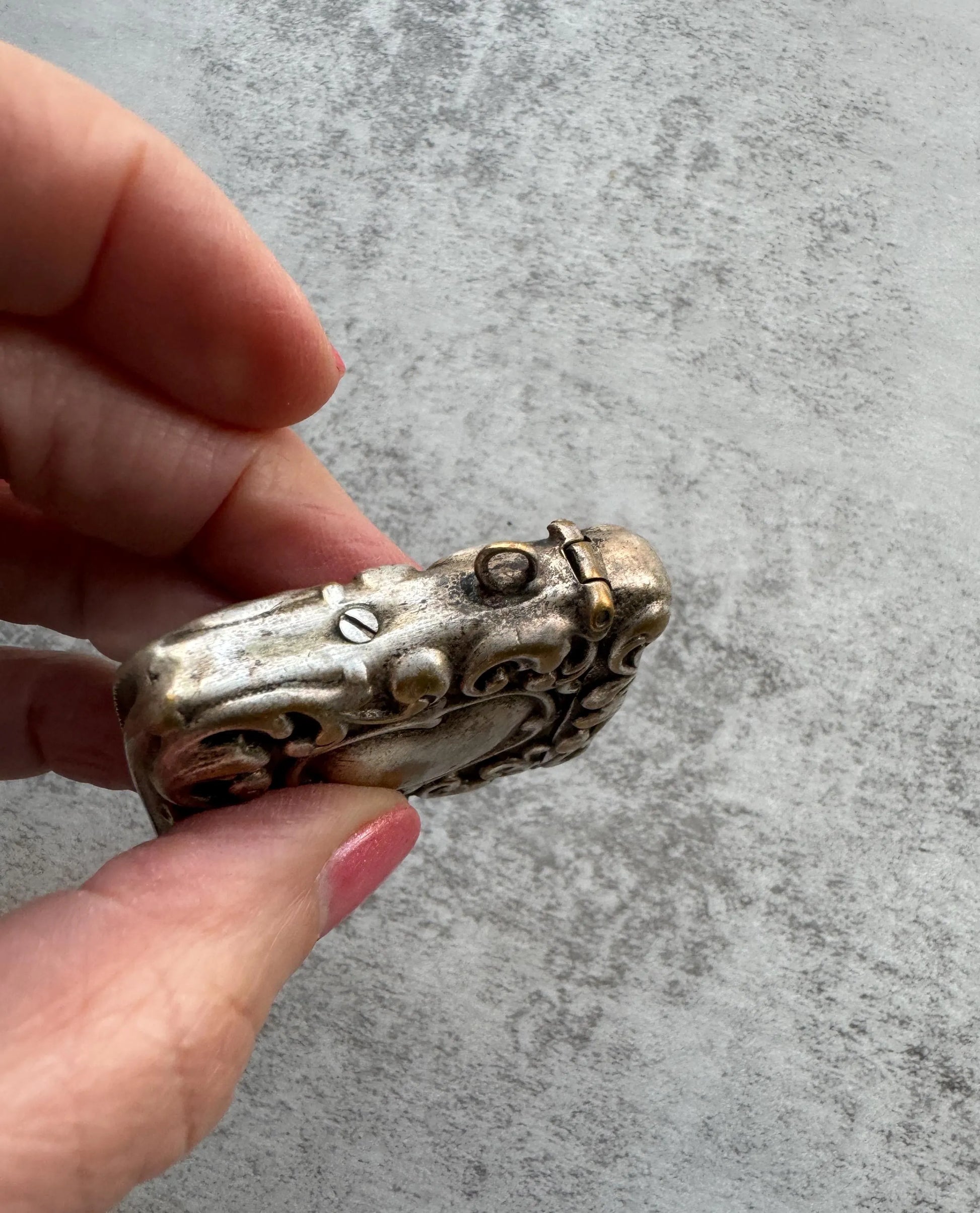 Antique Match Vesta, French Silver Plated Repousse Match Case, Edwardian Chatelaine Match Holder
