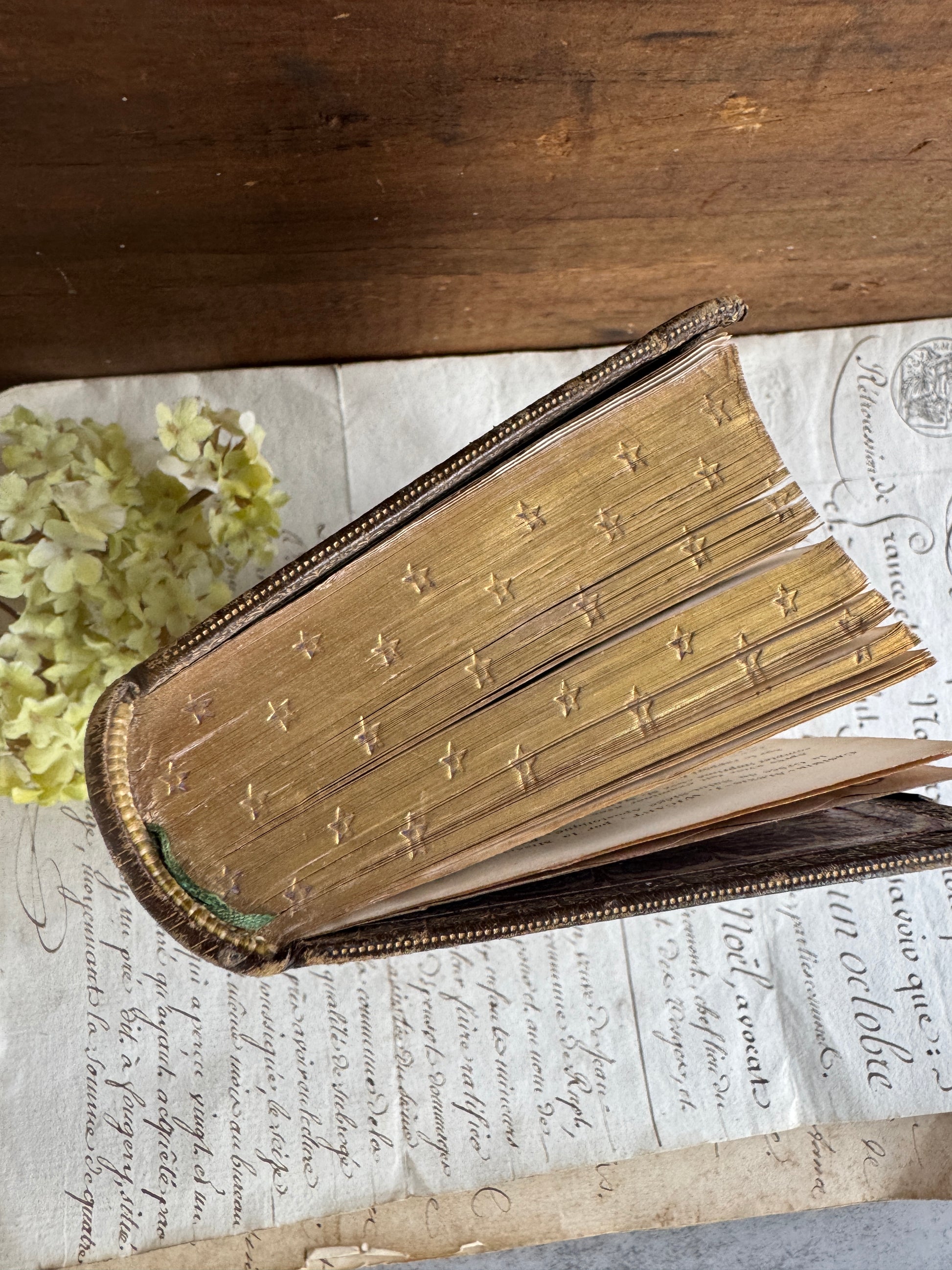 A beautiful 1857 French Paroissien Romain (Roman Parishioner’s Prayer Book) An exquisite antique Catholic book featuring a dark brown leather cover with ornate metal clasps, embossed “B P” on the front. The gilded page edges are delicately embossed with star motifs, adding a touch of divine elegance.
