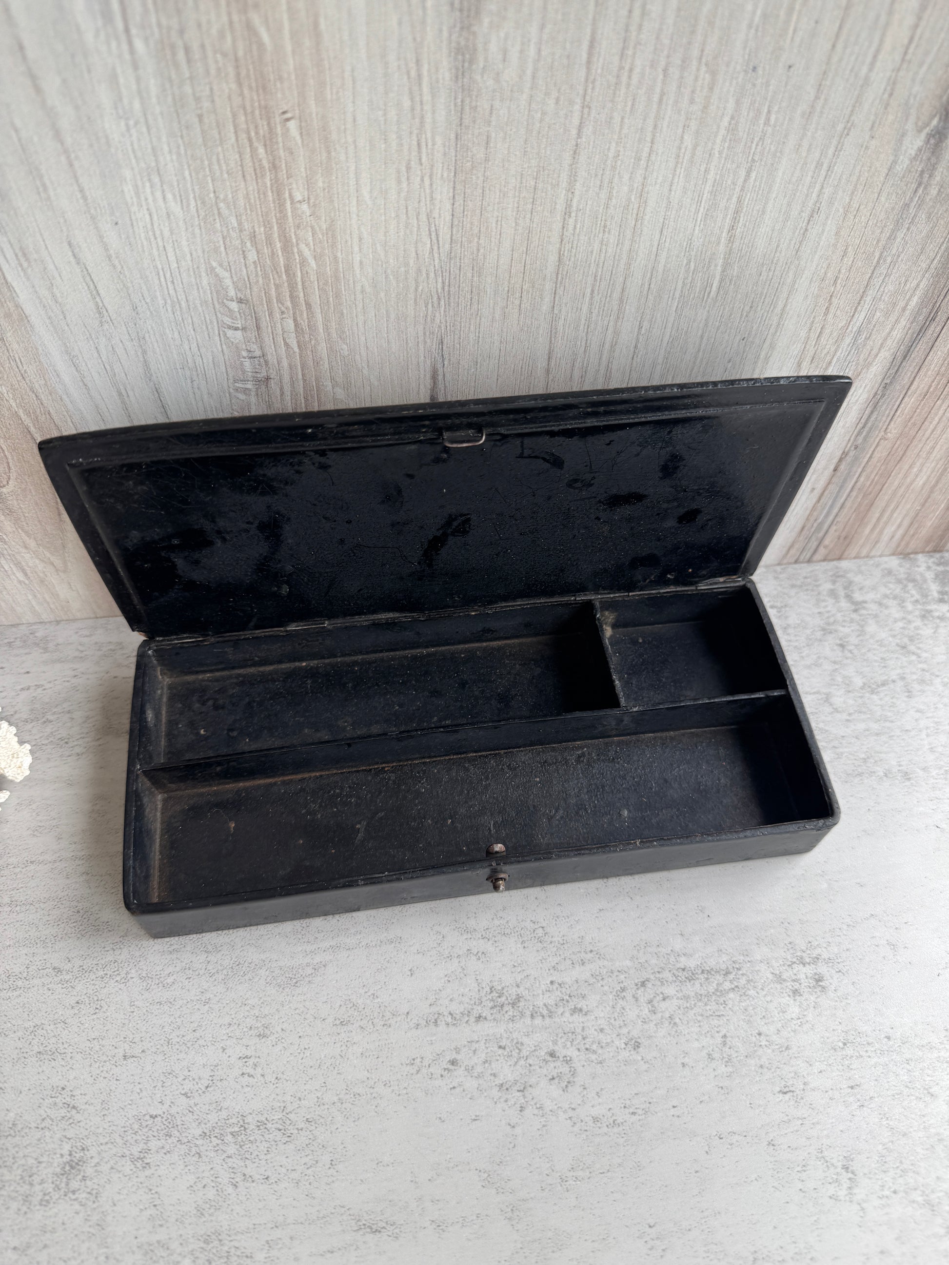 A beautifully detailed 19th century Victorian black lacquer box featuring an English fox hunting scene on the lid. The interior is divided into compartments, making it functional, yet stylish. Likely used as a pencil or writing box. Perfect for anyone interested in writing, equestrian or finely crafted Victorian items. Measures 8.5" x 3.75". The latch on front is working correctly. With some surface wear. Found in Provence.