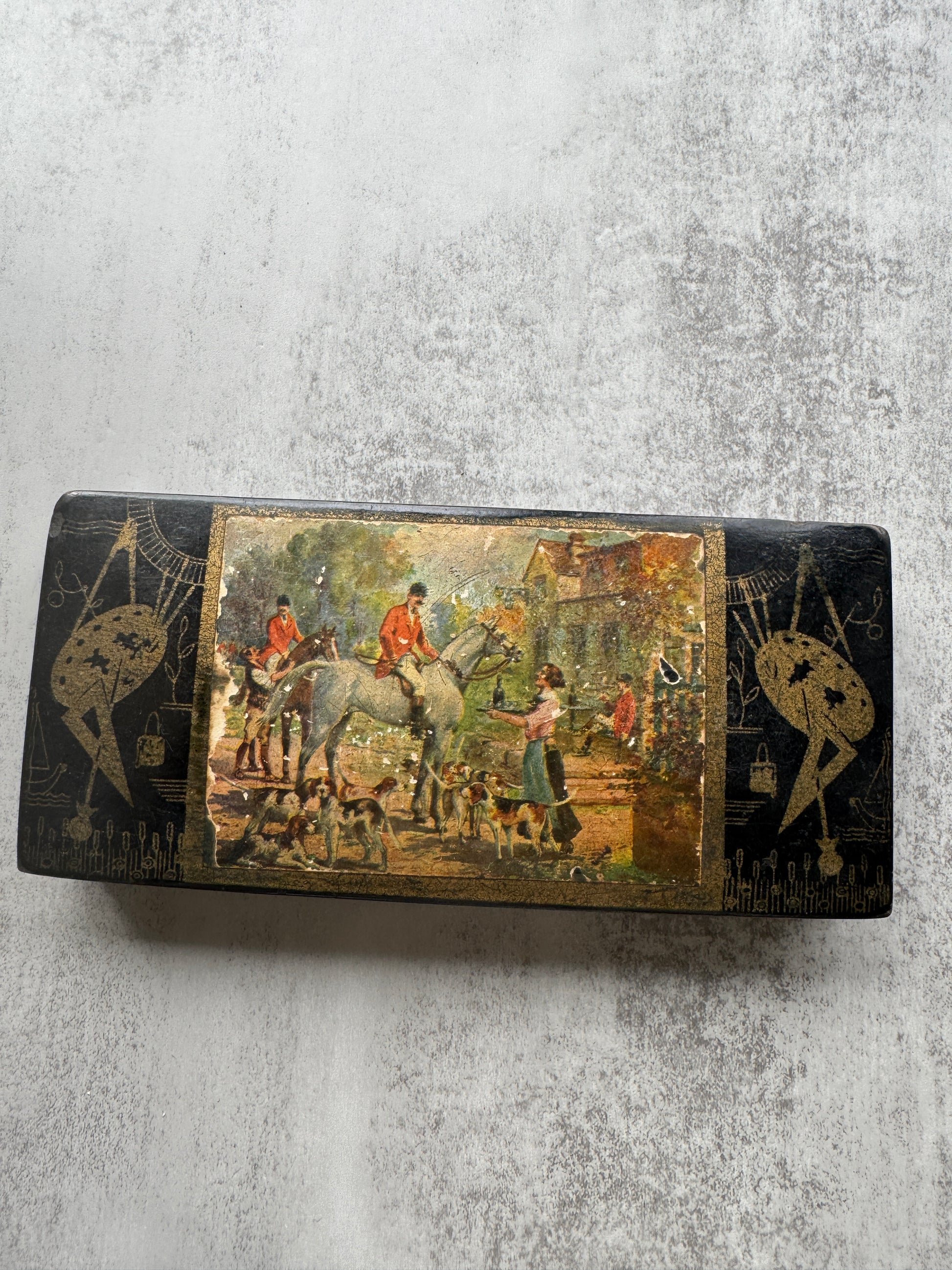 Antique Victorian Black Lacquer Pencil Box with Fox Hunting Scene, 19th Century