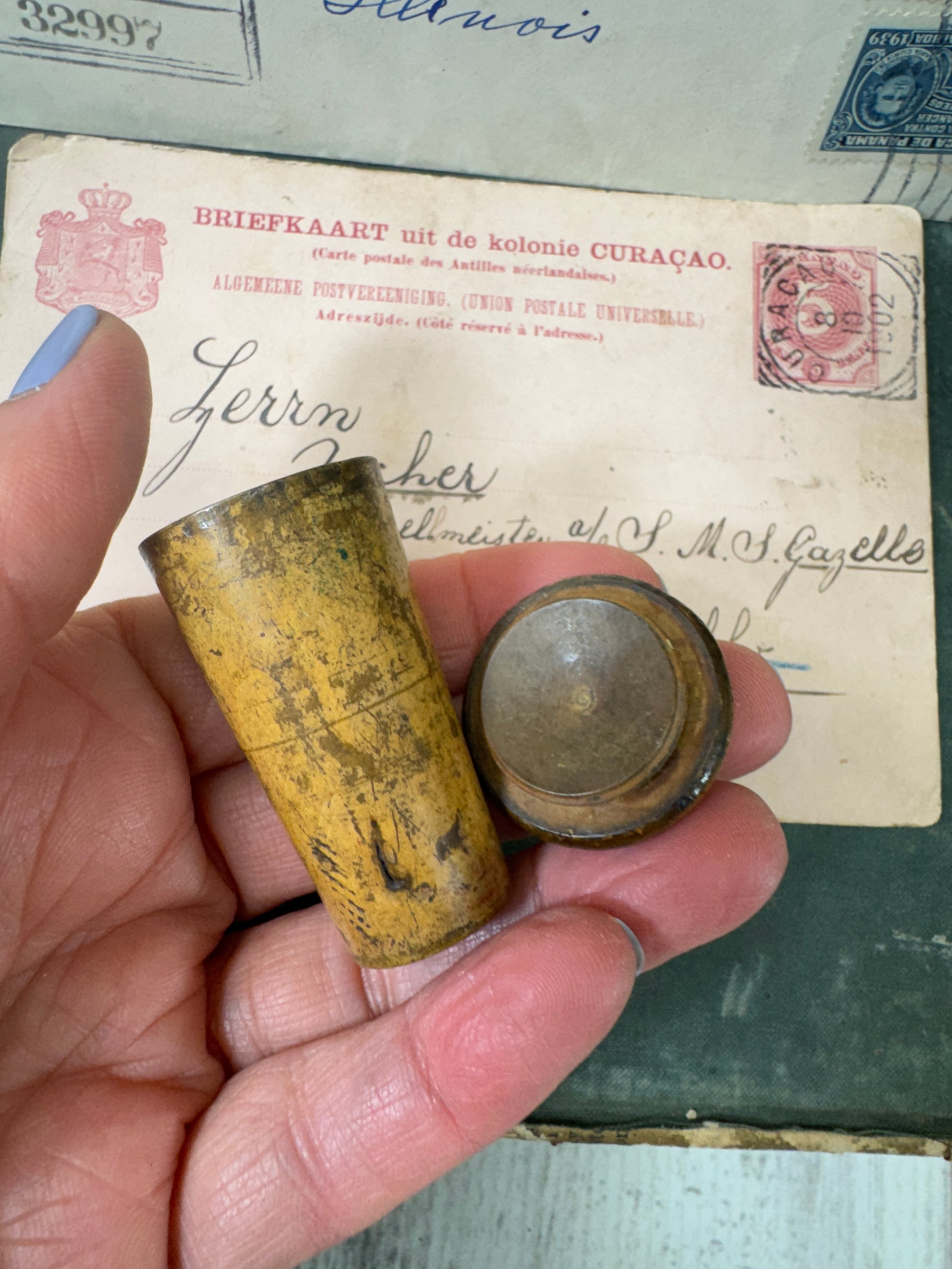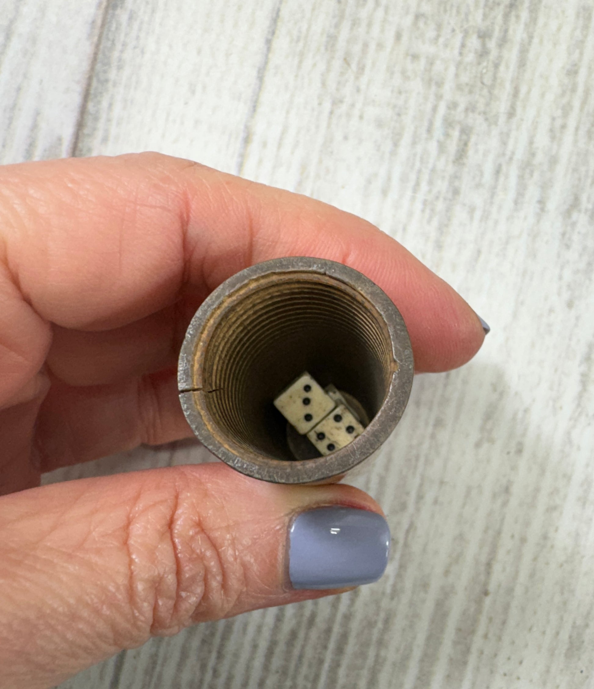 This vintage wooden dice shaker set is a beautifully aged piece, complete with three tiny dice that fit snugly inside the screw-top case. Likely used as a travel game in the late 19th or early 20th century, it’s both functional and full of charm. The warm patina of the wood and the delicate dice make it a lovely collectible for game lovers, travelers, or anyone drawn to antique curiosities. A great addition to a shelf, desk, or game table. Measures 2.25" tall.