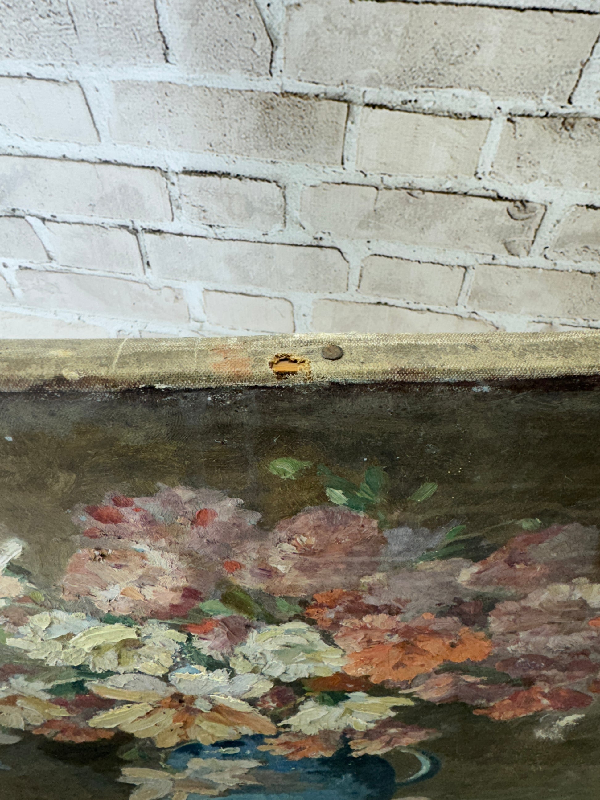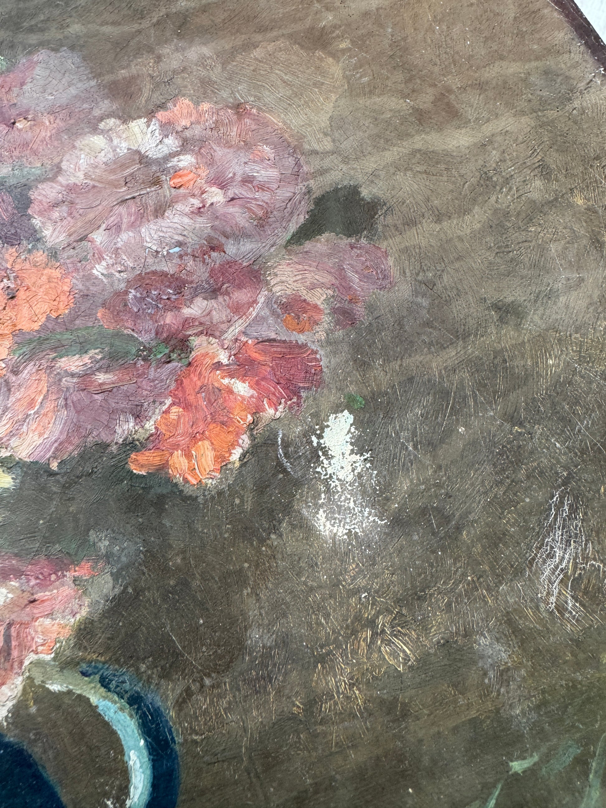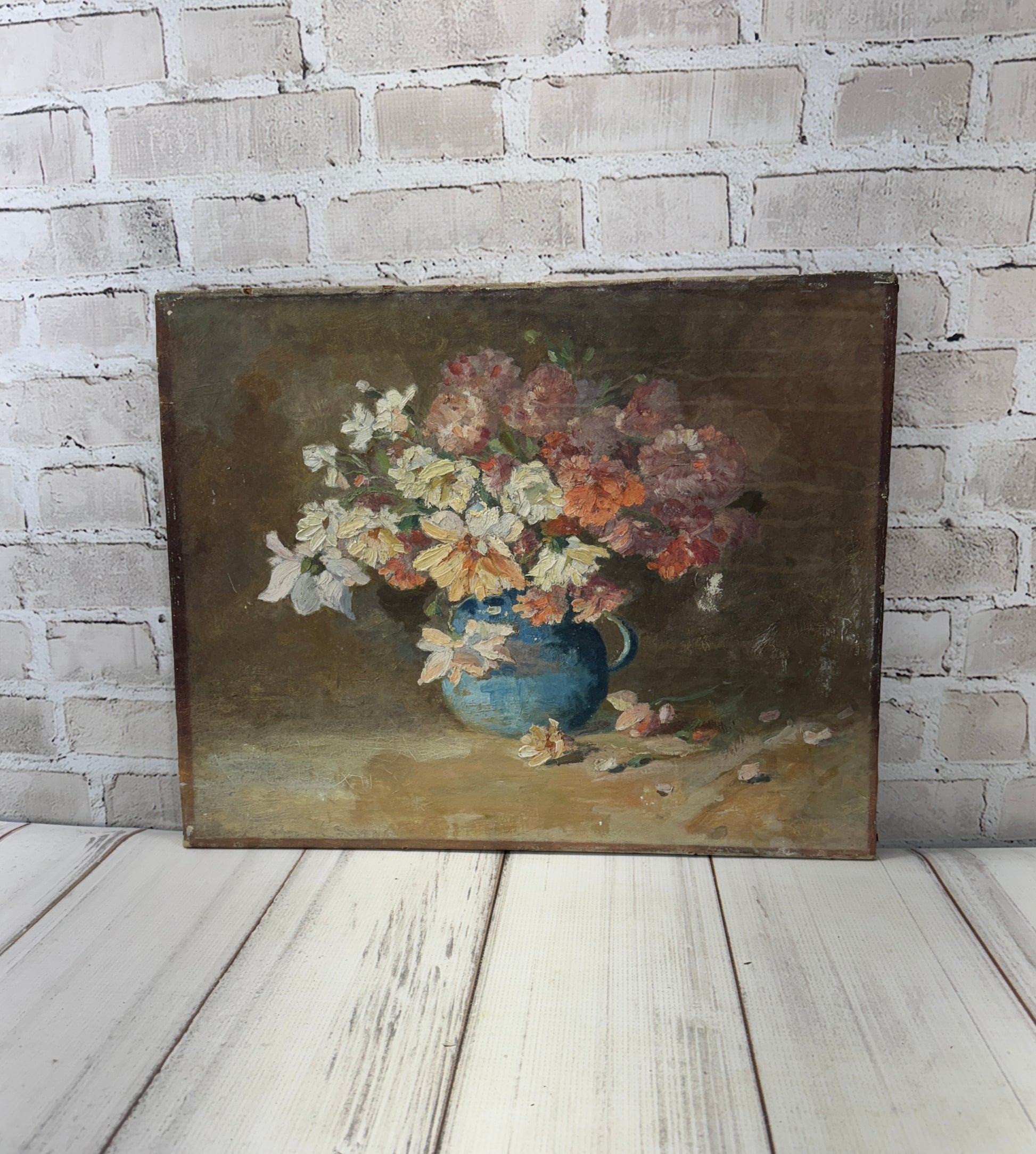 Antique French Floral Painting, Still Life in Blue Pitcher