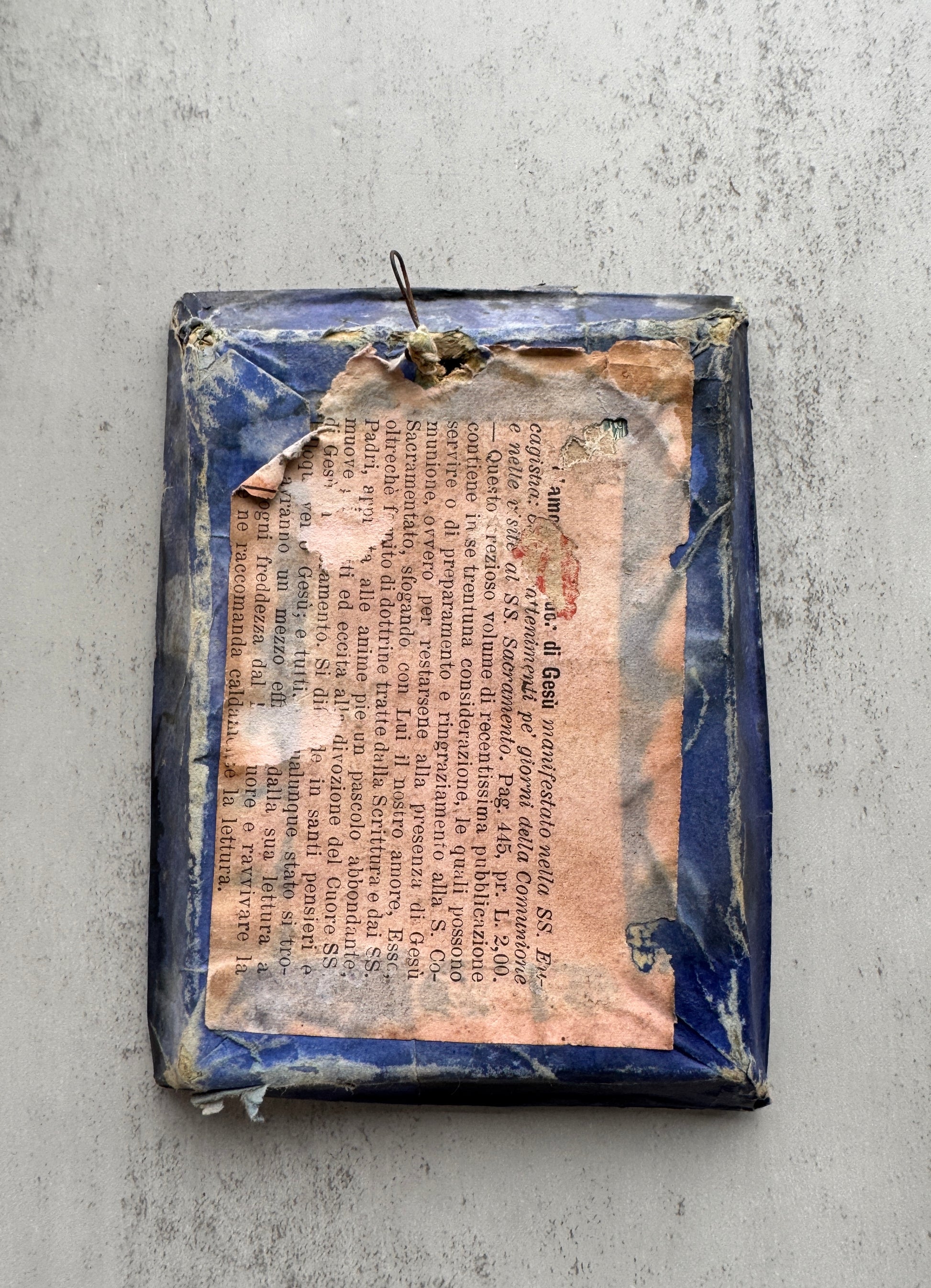 A rare 19th century Italian ex-voto reliquary shadow box, featuring a delicate holy figure, surrounded by lace, fabric and dried flowers. Encased in a simple wooden frame with a glass front. The back is covered in Italian religious text. Measures 5.25" x 4". This piece shows signs of age and wear, with visible chipping and some looseness in the interior elements. Despite this, it remains a beautiful and meaningful example of religious folk art.