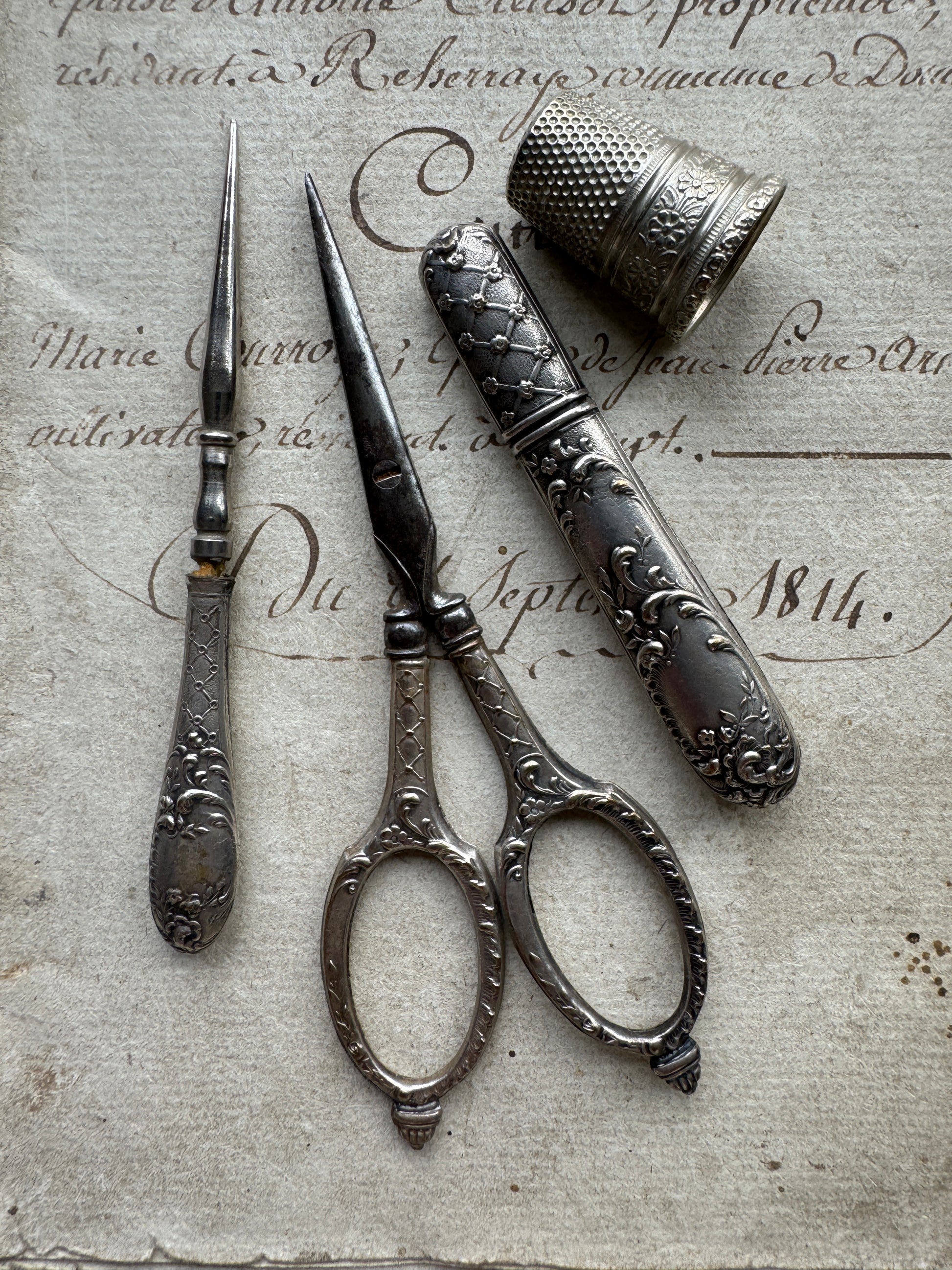 This antique French sewing etui set, originally from the 1800's, is the perfect addition to any sewing collection. This beautiful kit is not only functional but also adds a touch of elegance to your sewing experience. Case measures 5" x 3". With some surface stains. Inside fabric is frayed along the hinge and it has some discoloration. Comes with sewing scissors, needle case, thimble and stiletto. I couldn't find any stampings, could be silver or silverplated.