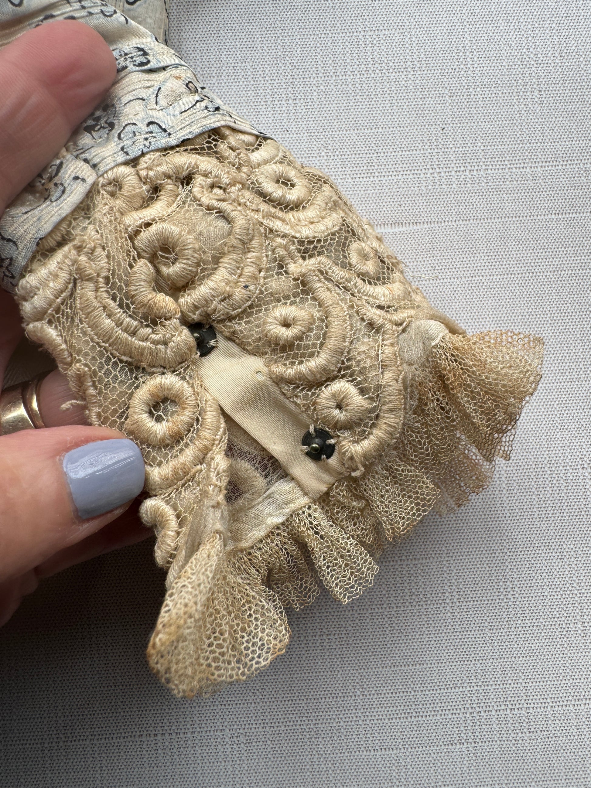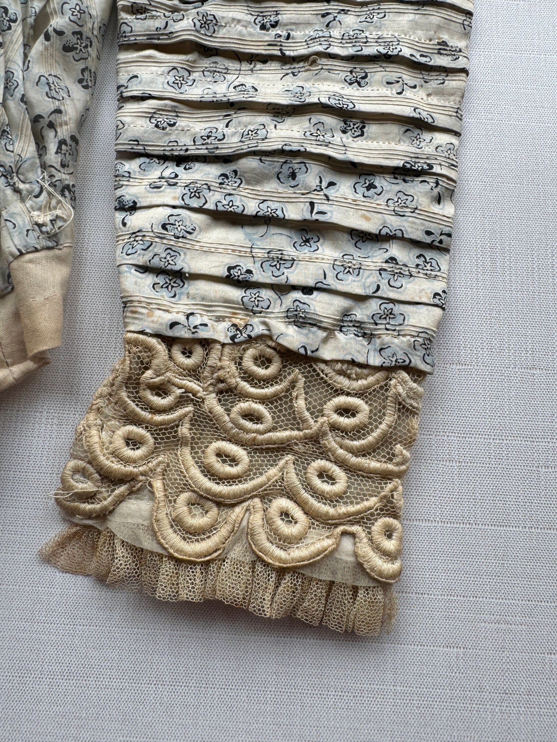 This lovely antique French bodice dates to around 1900 and was entirely hand-stitched by the Maison Pessin Sœurs of Nîmes. Made from soft floral fabric with delicate lace at the collar and cuffs, it features a classic Edwardian high neckline and tailored shape. The interior is beautifully constructed with fine stitching and light boning for structure.